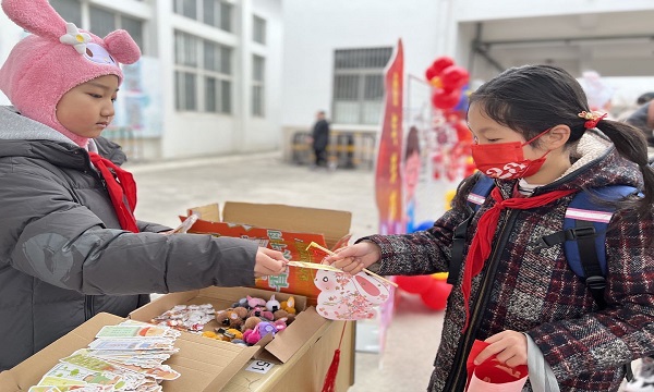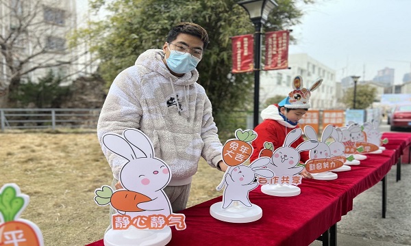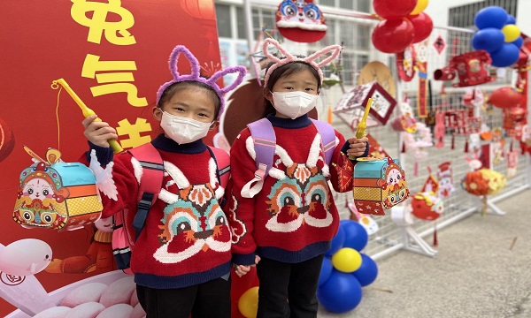开学前让孩子们动手设计制作带有新年、元宵两个节日元素的手工作品,如主题画、对联、灯笼、剪纸等等……,用来装扮新学期的校园,对足够“兔”气的作品,执勤老师和大队委将为他们发放发放兔年纪念品,并在展板中“亮靓相”。让孩子们在活动中锻炼动手能力,在参与中体会成就感,在亲自布置展板中感受节日的氛围。报道当日还有的同学们戴上了带有“兔”元素的配饰、口罩等;手持带有“兔”元素的道具,美美的开心迎来新学期。