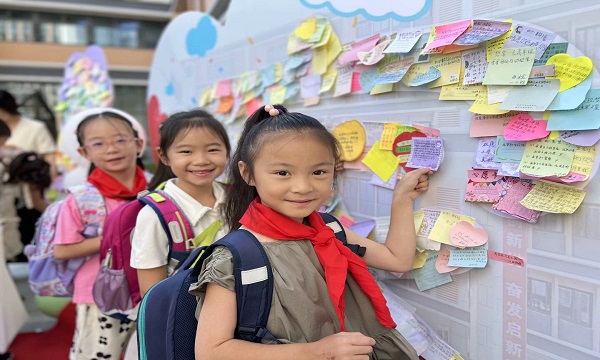 一张张便利贴上描绘了孩子们对新学期的期许,大家将心愿和祝福“藏”在便利贴里,贴到展板上,让“家”被一点点填满。汇聚了所有同学的祝福后,我们的“家”从空白变成了五颜六色,象征着五彩斑斓的学校生活,也代表着浓浓的温馨与幸福。