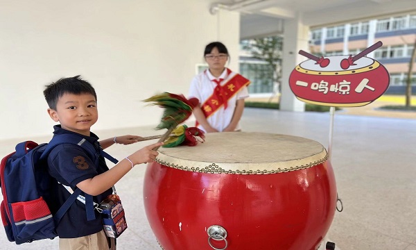 接着,孩子们走到大鼓前敲一敲,震天的鼓声,象征着孩子们在新学期即将一鸣惊人。敲完后清凉娃们还得到了一颗糖果,寓意在新的一学期里校园生活甜甜蜜蜜。