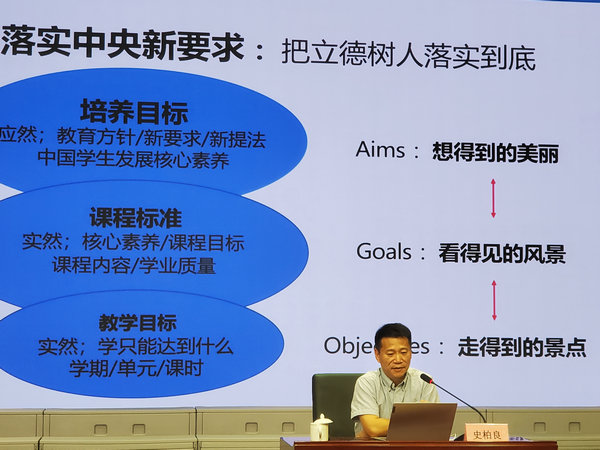 紧接着由区发展中心史柏良主任进行“新方案、新课标、新教学、新评价”专题讲座。史主任围绕“培养目标的确定、课程设置与教材编写的优化、实践性和学段衔接的重要性以及课程思维和考试评价制度的改革”等几个核心议题展开了精彩纷呈的讲解。