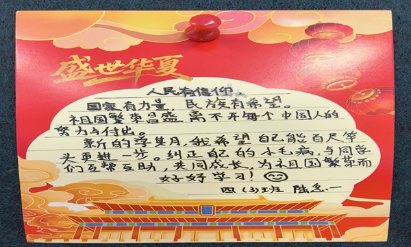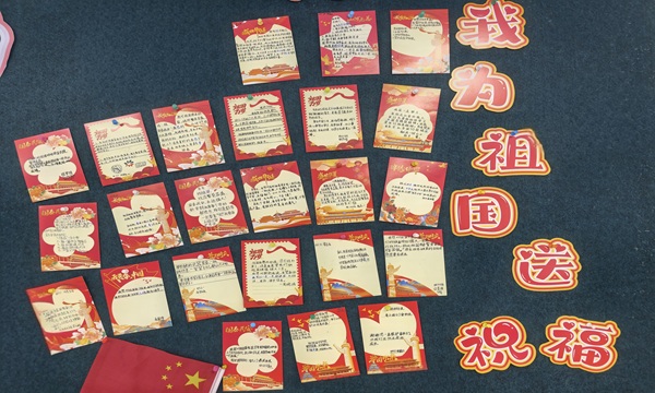 阅兵式结束后,各班有序开展心愿卡书写活动。同学们纷纷执起画笔,铺展彩纸,精心写下对祖国的炽热祝福。“愿祖国繁荣昌盛”“祝祖国日益强盛”等真挚话语,承载着孩子们对祖国的深情眷恋与美好期盼。