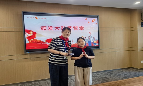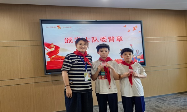 会议伊始,程老师阐明了此次会议的重要意义,强调大队委作为校园管理与少先队活动开展的核心力量,肩负着服务同学、助力校园发展的重要使命。随后,会议进入庄重的颁章环节,陆校亲自为每一位大队委佩戴大队委标志臂章。当鲜红的臂章稳稳别在手臂上时,全体大队委眼神坚定,充分展现出接过责任与使命的自豪与担当。